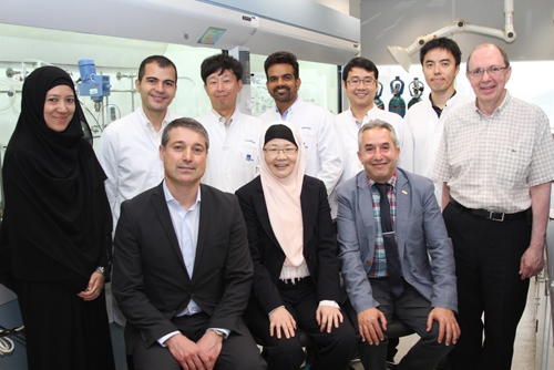 The NanoBio Lab and Hydro-Québec research team. Seated left to right: Mr. Guillaume Hayet- Senior Director- Commercial Projects- Hydro-Québec; Prof. Jackie Y. Ying- A*STAR Senior Fellow- NanoBio Lab- and Dr. Karim Zaghib- General Director- Hydro-Québec CETEES. Standing left to right: Ms. Noreena AbuBakar- Director- Corporate Administration- NanoBio Lab; Dr. Ayman Abdelhamid- Postdoctoral Fellow- NanoBio Lab; Dr. Jaehong Lim- Senior Research Scientist- NanoBio Lab; Dr. Nandanan Erathodiyil- Principal Research Scientist- NanoBio Lab; Dr. Jinhua Yang- Research Scientist- NanoBio Lab; Mr. Jian Liang Cheong- Senior Lab Officer- NanoBio Lab; and Dr. Michel L. Trudeau- Group Leader- Materials Characterization- CETEES.