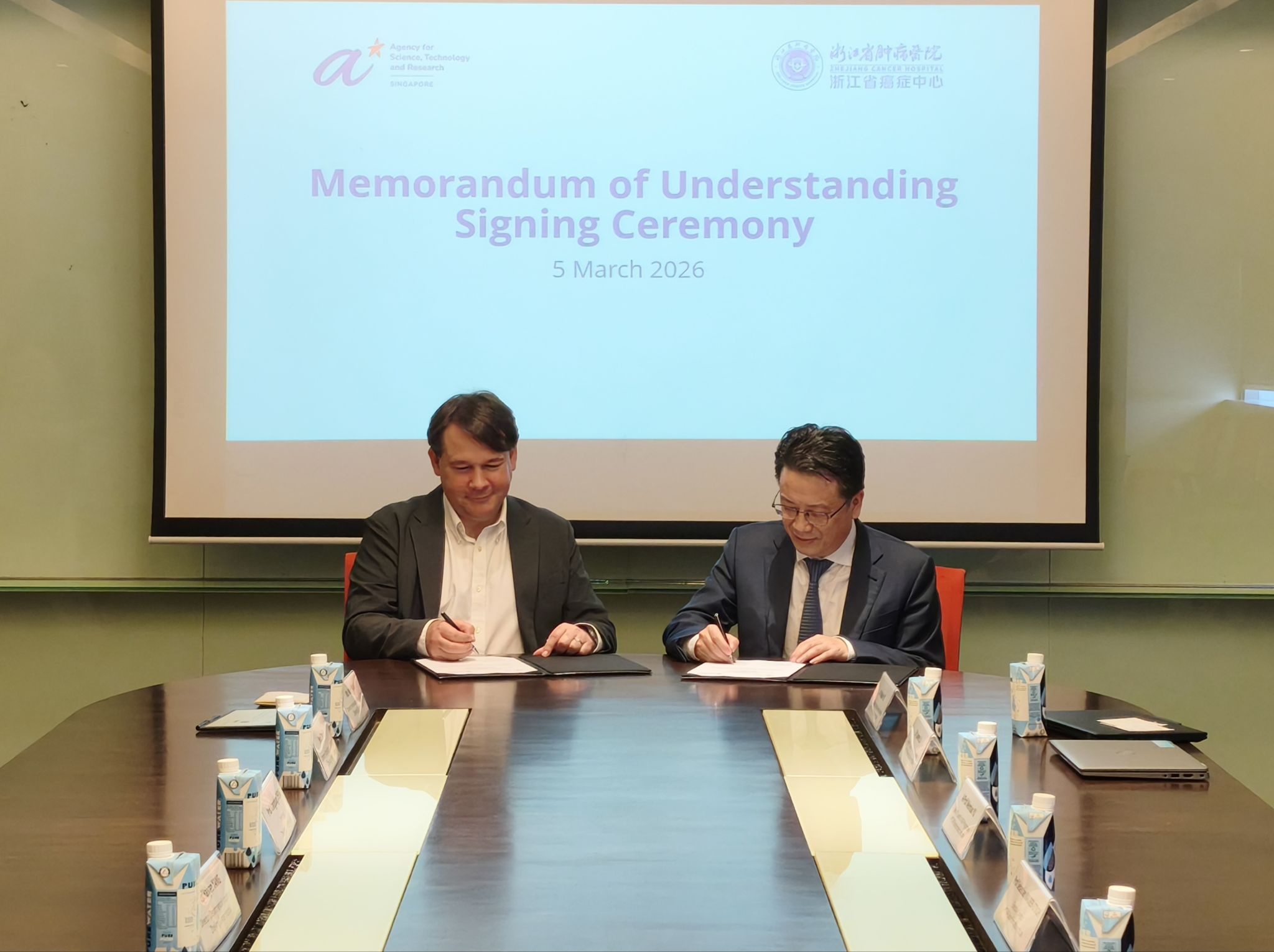A*STAR Bioinformatics Institute (A*STAR BII) has signed a Memorandum of Understanding with Zhejiang Cancer Hospital (浙江省肿瘤医院) to strengthen collaboration in AI-driven digital pathology and drug discovery.