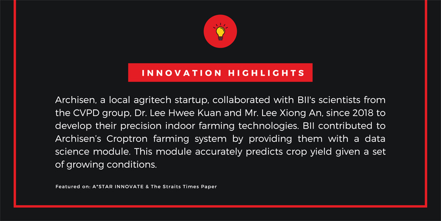 Archisen, a local agritech startup, collaborated with BII's scientists from the CVPD group, Dr. Lee Hwee Kuan and Mr. Lee Xiong An, since 2018 to develop their precision indoor farming technologies. BII contributed to Archisen's Croptron farming system by providing them with a data science module. This module accurately predicts crop yield given a set of growing conditions.For more details, please read article from Straits Times on Archisen here