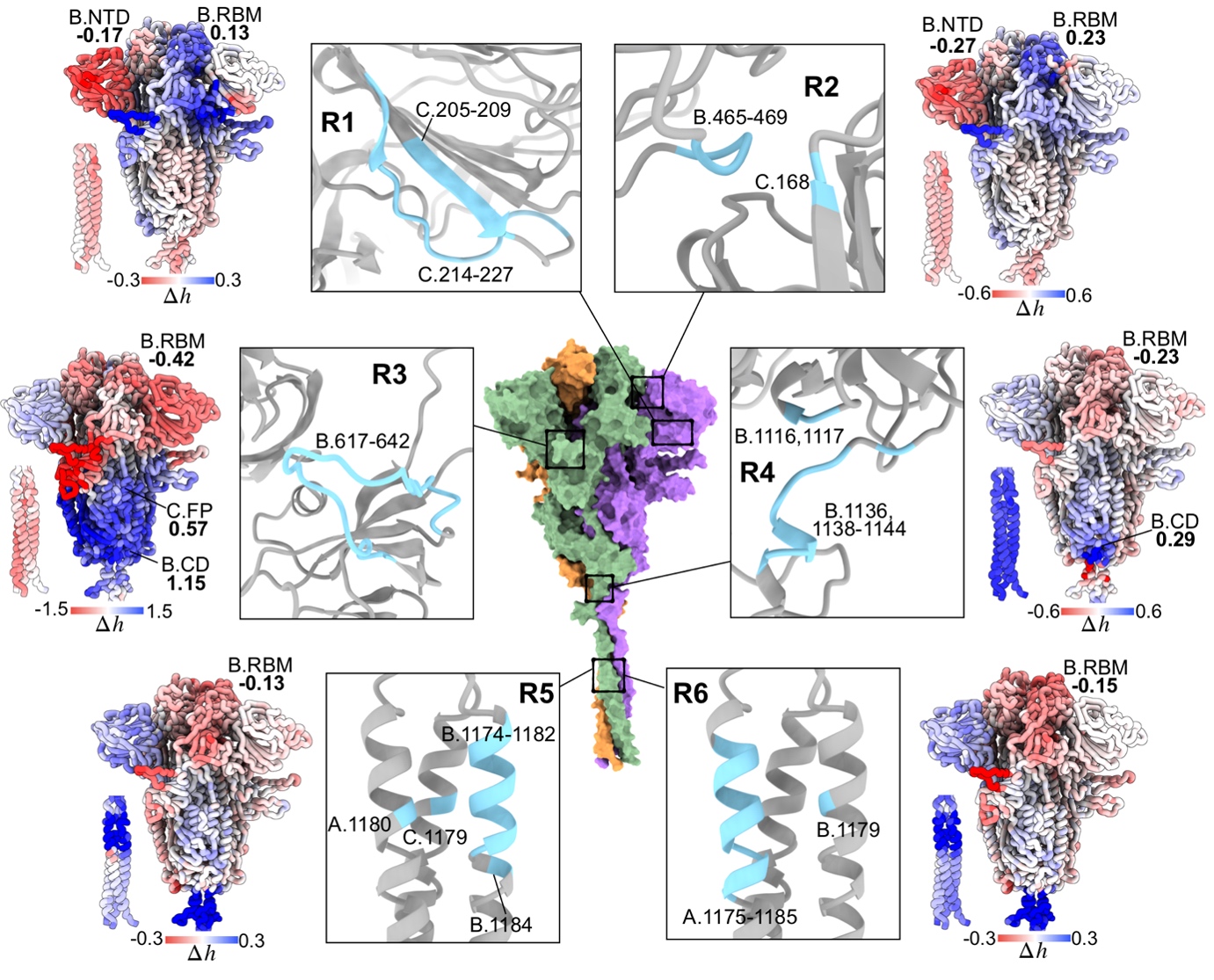 We applied the framework to a range of human and viral proteins involved in diseases, for example isocitrate dehydrogenase causing leukemia, the Spike homotrimer and RNA polymerase from SARS-CoV-2. Using the Spike protein, the focal point of therapeutic interventions targeting COVID-19, as an example, we showed that some emerged mutations in variants of concern cause large allosteric modulation in the distant receptor binding motif (Structure 30, 590). Importantly, we also performed a comprehensive analysis of prospective druggable allosteric sites (Figure 4), and identified beneficial amino acid changes that may neutralize the deleterious allosteric effects of circulating mutations in variants of concern. As COVID-19 is transitioning into an endemic disease, our result will be important for advancing the development of allostery-based therapeutics leveraging the strength of allosteric drugs in circumventing recurring issues of drug resistance, and improving efficacies of biologics such as monoclonal antibodies and vaccines via allosteric effects of mutations.