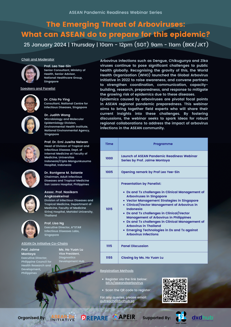 Epidemics caused by arboviruses are pivotal focal points in ASEAN regional pandemic preparedness. This webinar aims to bring together field experts who will share their current insights into these challenges. By fostering discussions, the webinar seeks to spark ideas for robust regional collaborations to address the impact of arbovirus infections in the ASEAN community.