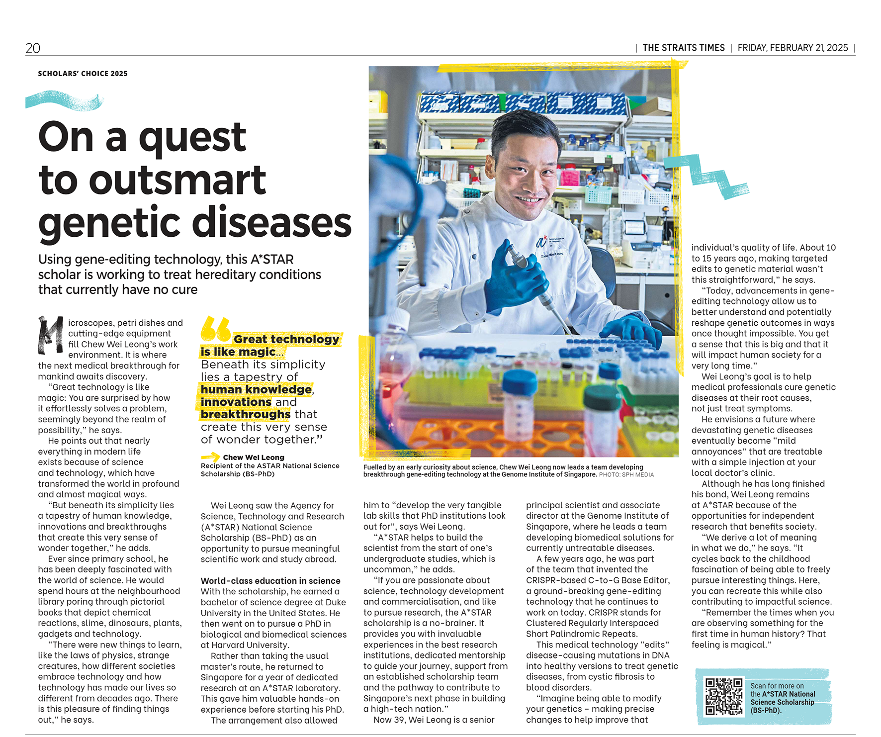 21 February 2025 - Dr Chew Wei Leong, Senior Principal Scientist at A*STAR Genome Institute of Singapore (A*STAR GIS) shares his journey at A*STAR. From an early age, he was deeply fascinated with the world of science. His passion led him to pursue an A*STAR National Science Scholarship, earning degrees from Duke University and Harvard University. Wei Leong currently leads a team to develop biomedical solutions for currently untreatable diseases. He was part of the team that invented the CRISPR-based C-to-G Base Editor, a ground-breaking gene-editing technology that he continues to work on today. Read his story below: