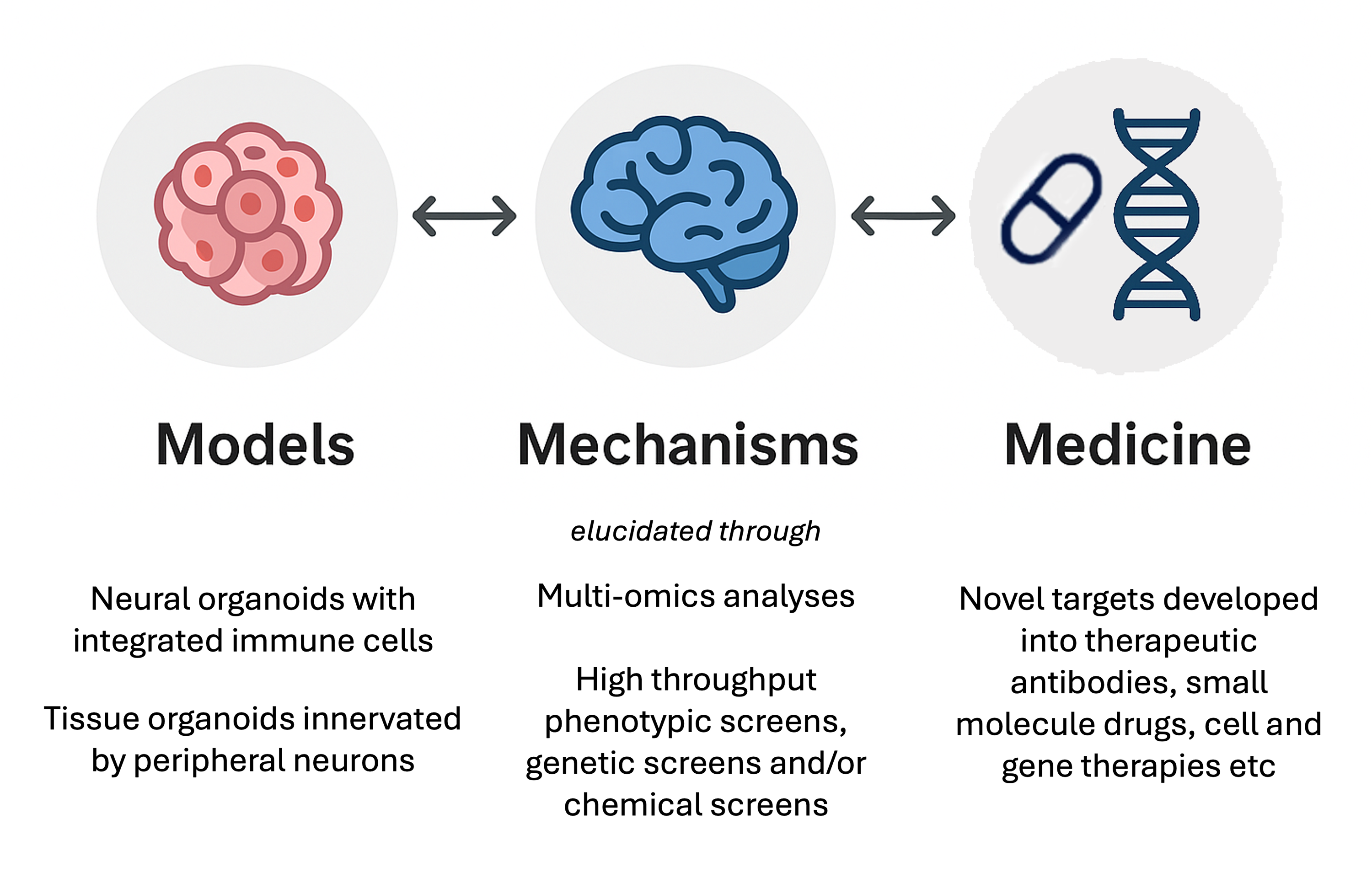 Our research aims to functionally integrate human immune cells with brain organoids and human autonomic neurons with peripheral tissues (e.g. cardiac tissues) to create physiologically-integrated models that more faithfully recapitulate human biology. These next-generation models will enable mechanistic studies that provide a transformative platform for uncovering disease mechanisms and accelerating therapeutic discovery.