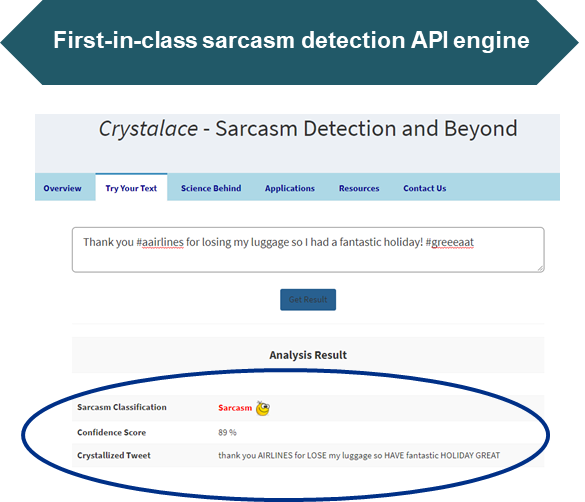 The underlying predictive algorithm underneath Crystalace sarcasm detection engine has novel sociolinguistics-inspired, psychologically meaningful and explainable features. Crystalace has high detection accuracy with its F1-score approximates 0.66 tested with human-annotated ground truth data.