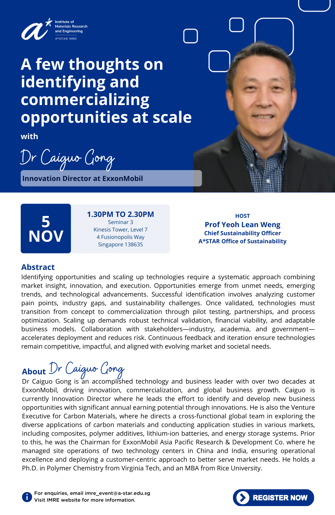 ExxonMobil Seminar at A*STAR - "A few thoughts on identifying and commercializing opportunities at scale" by Dr Caiguo Gong