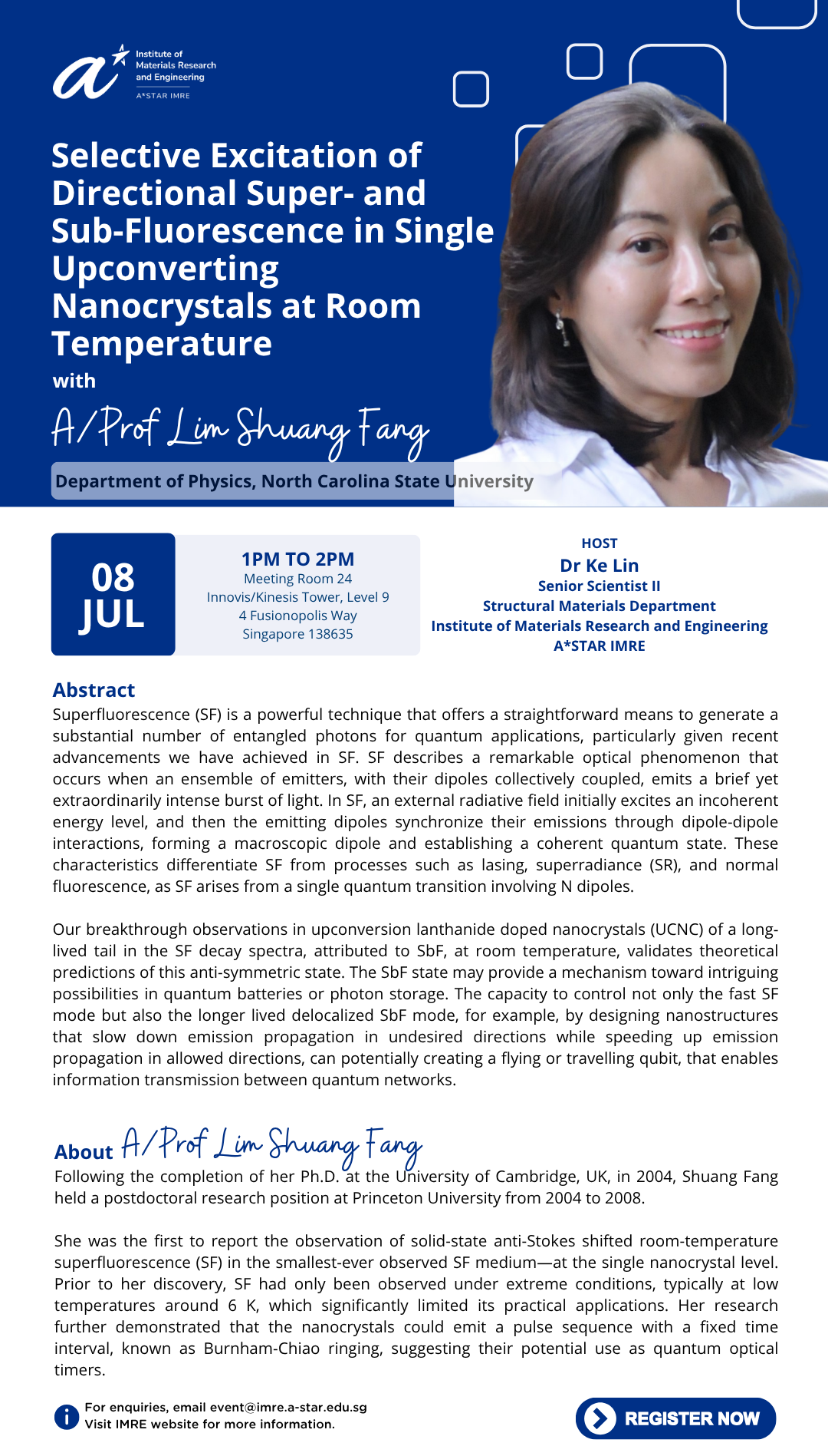 IMRE Seminar - "Selective Excitation of Directional Super- and Sub-Fluorescence in Single Upconverting Nanocrystals at Room Temperature" by A/Prof Lim Shuang Fang