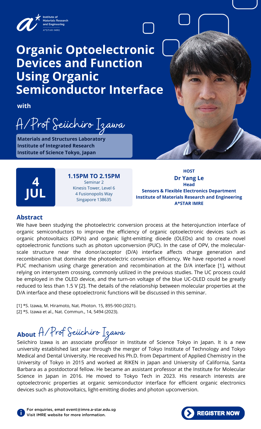 IMRE Seminar - "Organic Optoelectronic Devices and Function Using Organic Semiconductor Interface" by A/Prof Seiichiro Izawa