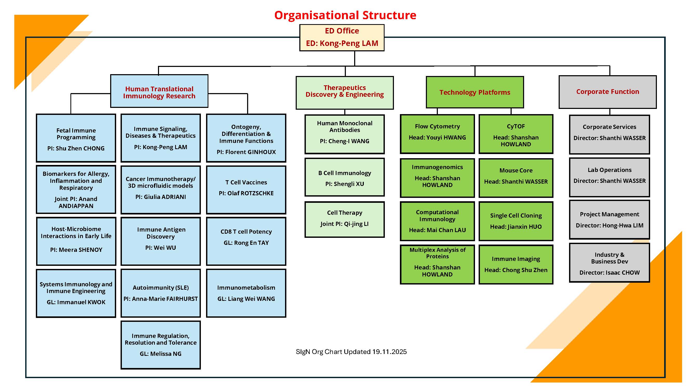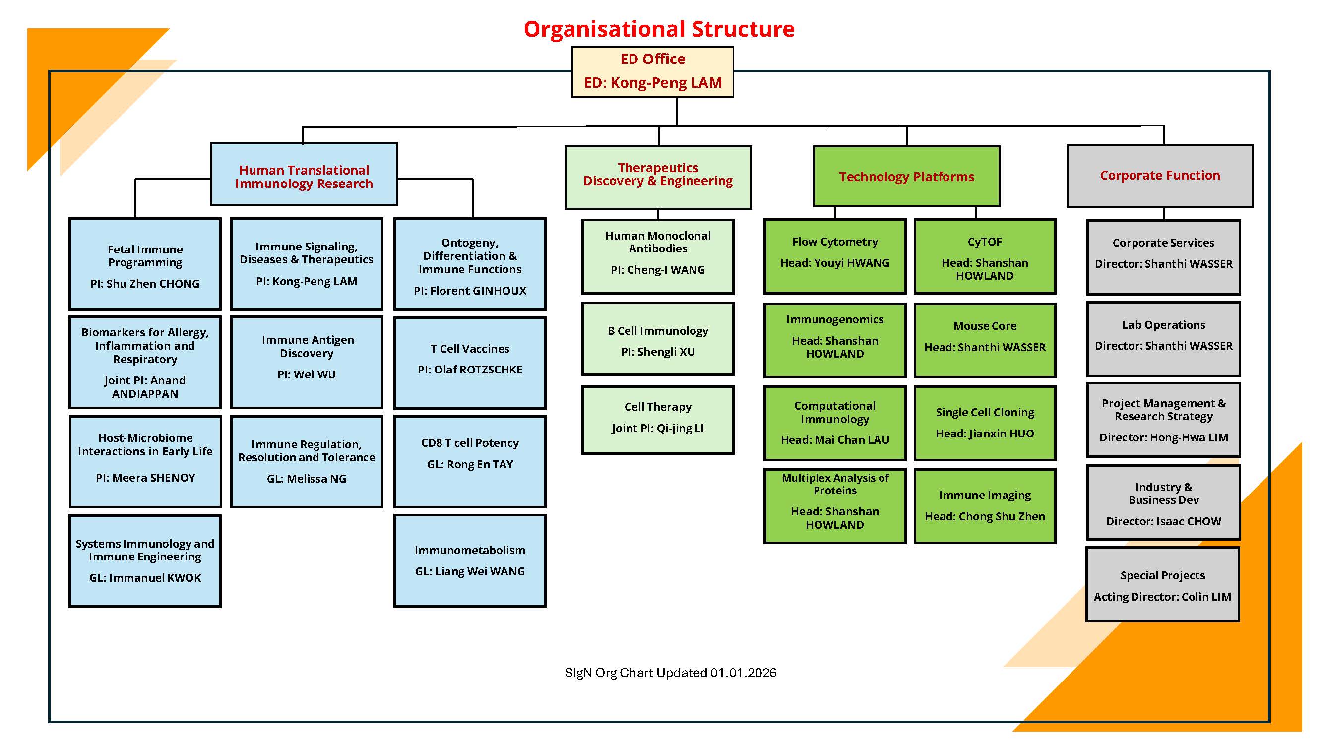 SIgN is home to ~110 researchers and support staff working under several Principal Investigators under the directorship of Professor Lam Kong Peng. The current SIgN researcher groups may be broadly categorized into three main areas of focus: Immunity, Cancer Immunology and Immune Dysfunctions. Our researchers also have key interests and expertise in Inflammation, Immunotherapy, Aging and Allergy. Our research activities are supported by a strong in-house cluster of cutting-edge technology platforms.